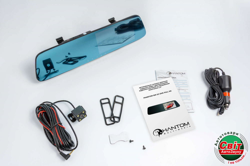 PHANTOM RM-53 DVR Full HD має відмінну дзеркальну поверхню, вбудований фронтальний Full HD відеореєстратор, камери заднього виду з функцією запису і сенсорний монітор 5,0, який служить для відображення сигналу з фронтального відеореєстратори, відеокамери заднього виду і управління функціями відеореєстратора.