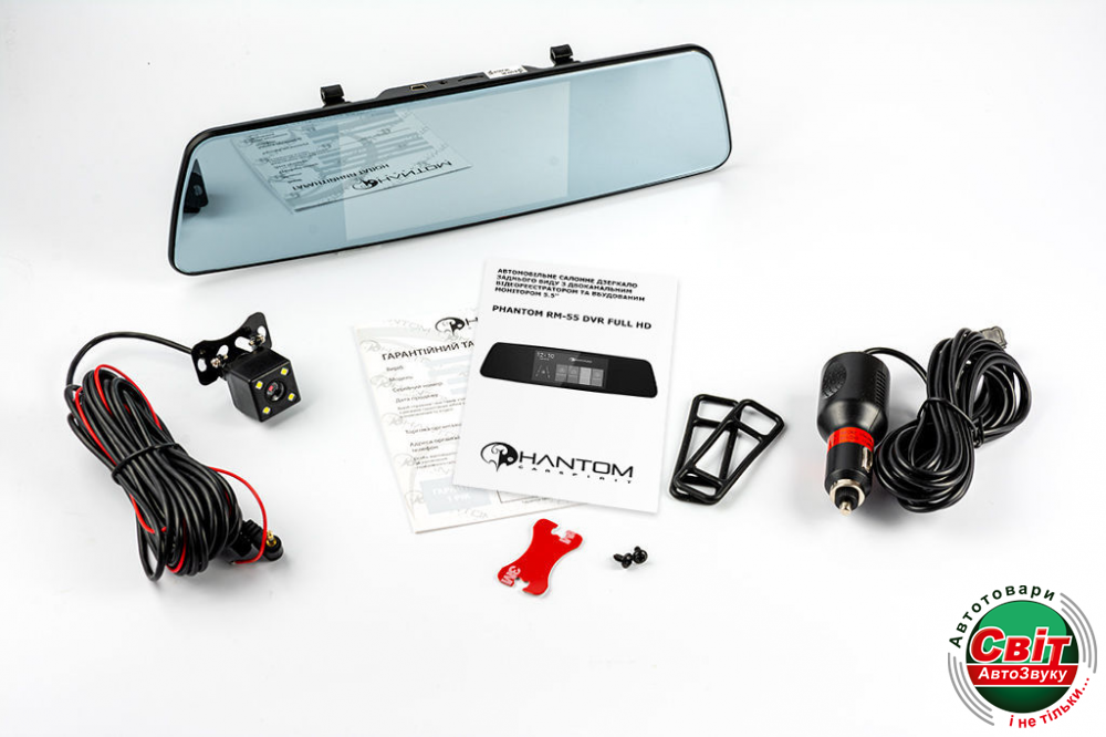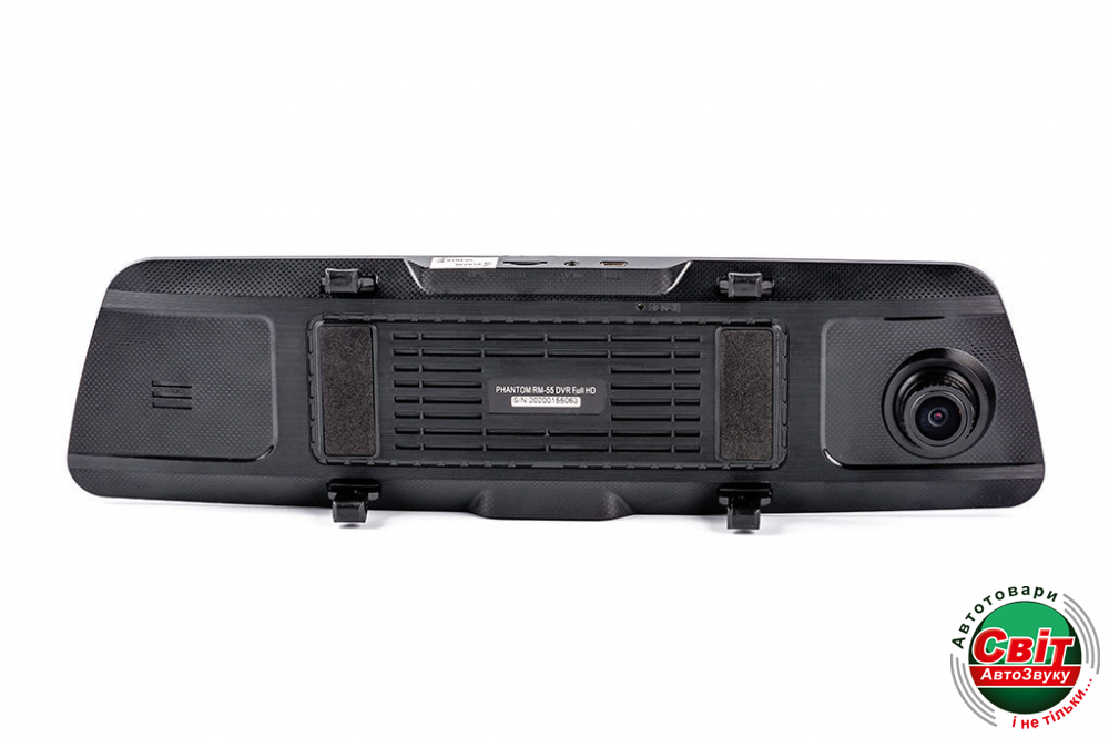 Phantom RM-55 DVR Full HD має чудову дзеркальну поверхню, вбудований фронтальний Full HD відеореєстратор, камери заднього виду з функцією запису і сенсорний монітор 5,5#8242;#8242;, який служить для відображення сигналу з фронтального відеореєстратори, відеокамери заднього виду і управління функціями відеореєстратора