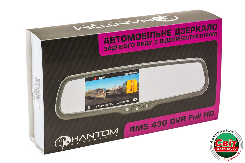 Зеркало с регистратором Phantom RMS 430 DVR Full HDPhantom RMS-430 DVR Full HD представляет собой салонное зеркало заднего вида со встроенным монитором 4,3″ и Full HD видеорегистратором.